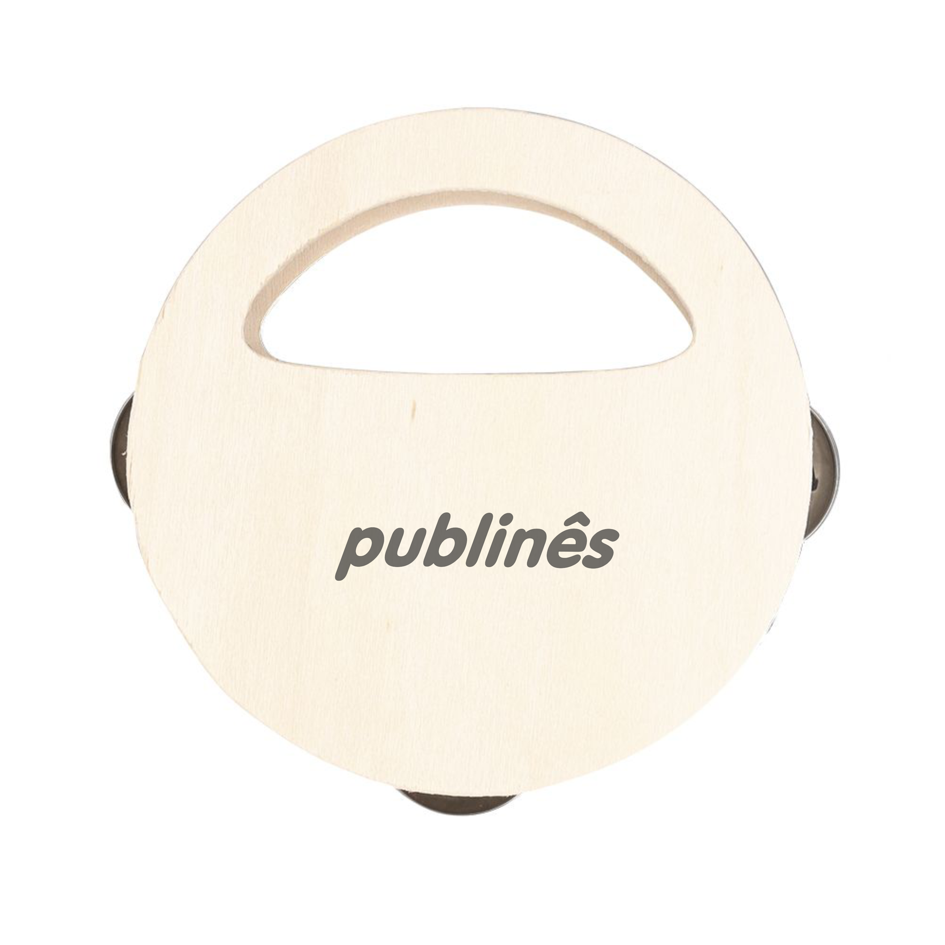 Pandeireta de madeira. Formato circular com alça prática para fácil manuseio e três pratos duplos de metal. Ampla superfície para impressão.